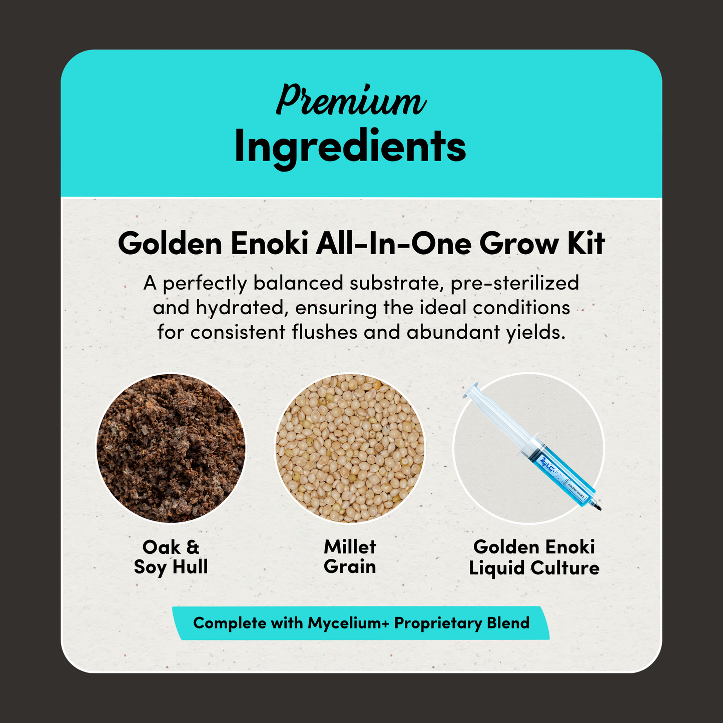 Unlock the Art of Mushroom Cultivation with the Mycelium Golden Enoki Gourmet Mushroom Liquid Culture Kit—perfect for beginners and seasoned growers alike. This all-inclusive kit is expertly designed to cultivate Golden Enoki mushrooms, using a powerful blend of oak, soy hull, and millet grain to create an ideal growing environment. Every element, from the nutrient-dense substrate to the high-quality liquid culture syringe, is carefully selected to ensure a successful, rewarding experience.